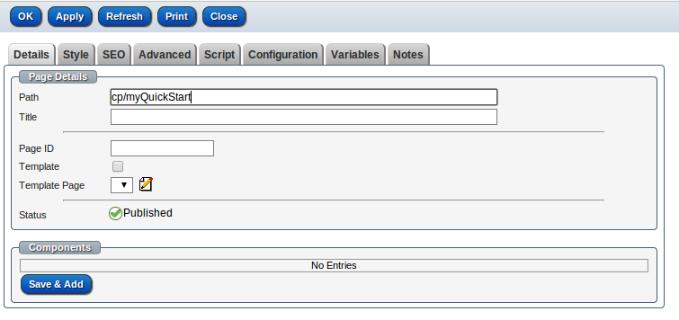 2. Click the "Clone" button for the page you'd like to modify, enter a path, eg: cp/myQuickStart and click "OK" button